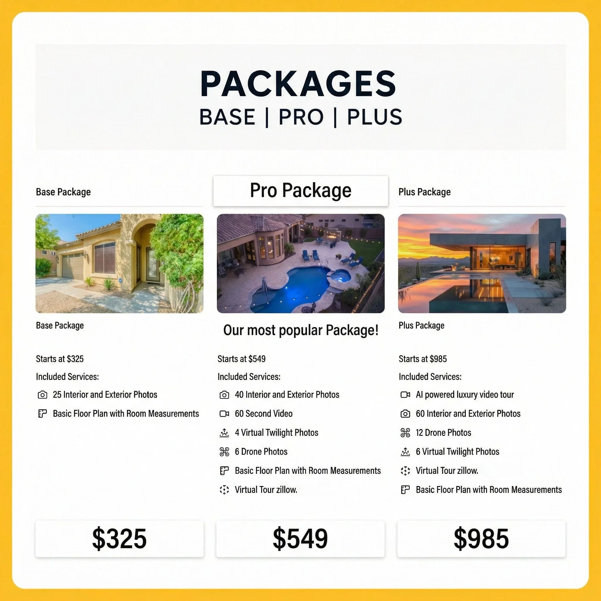 We offer simple flat rate pricing for our real estate images. For our 25 photos a we charge $175, and for 40 photos we charge $245, with floor plans included. No hidden fees, square footage or travel charges within our service area.